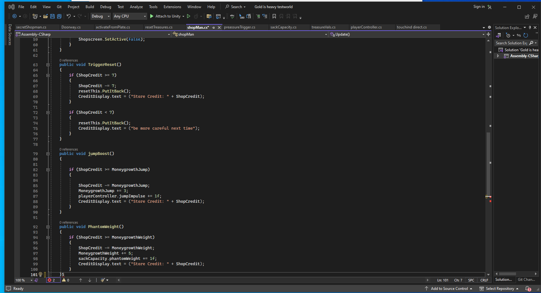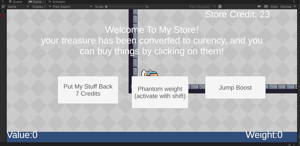 Gold is Heavy is a mechanics showcase for a weight-based platformer. It was made in Unity 2D and features a shop system, movement, and weight activated doors.